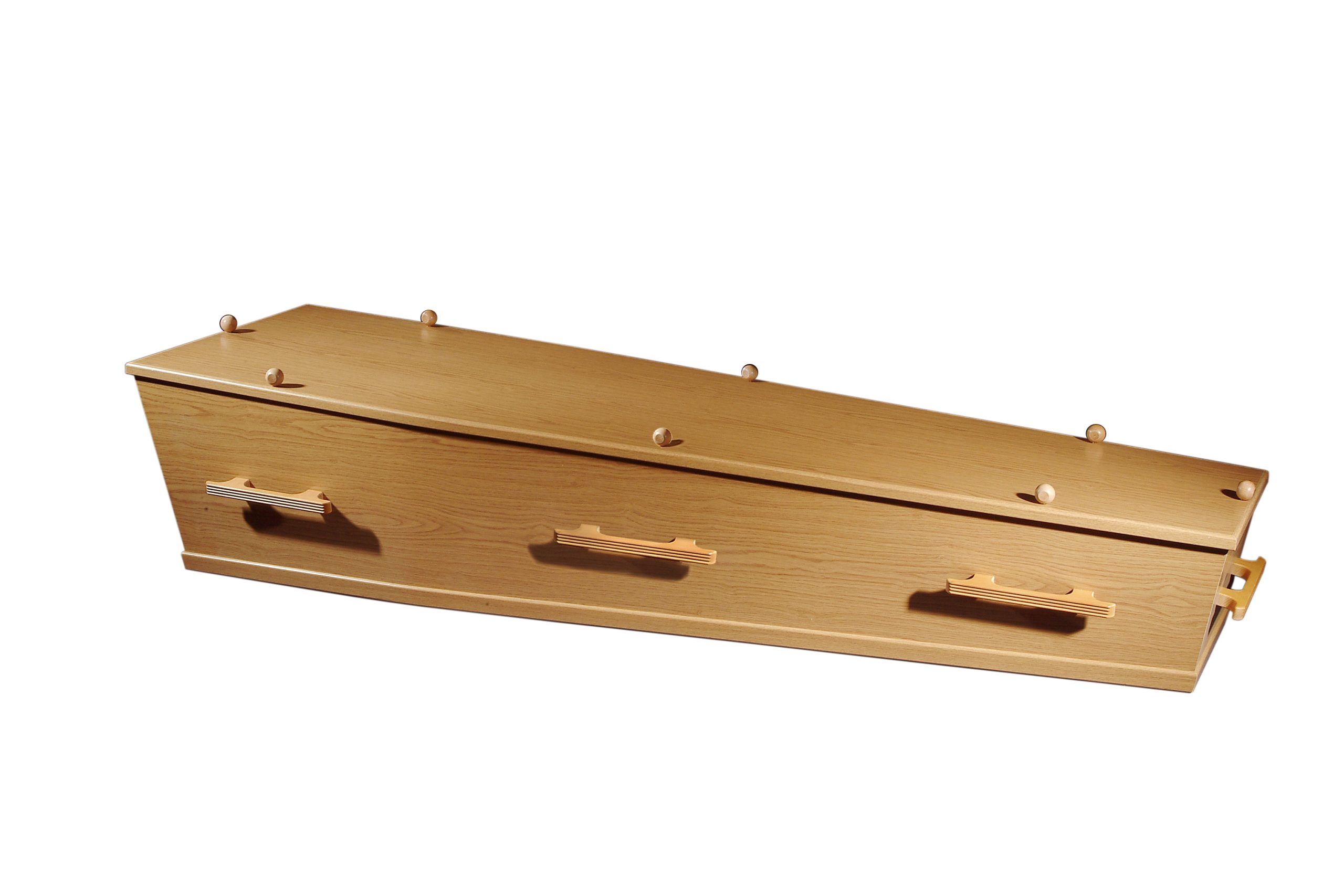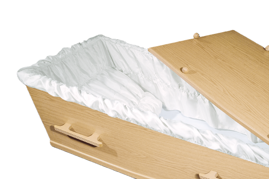 Eenvoudige spaanplaat uitvaartkist met eikenprintfolie en een satijnen interieur