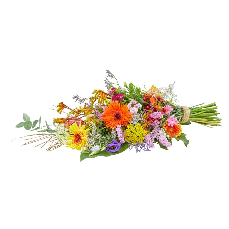 Het boeket ‘Zonnestraal’ in medium formaat is een stralend en kleurrijk arrangement dat warmte en positiviteit uitstraalt. Met een zorgvuldige selectie van bloemen in heldere, zonnige tinten brengt dit boeket een gevoel van hoop en troost naar elk afscheid. Het luchtige en evenwichtige ontwerp maakt ‘Zonnestraal’ tot een prachtige keuze voor een persoonlijke en liefdevolle laatste groet.