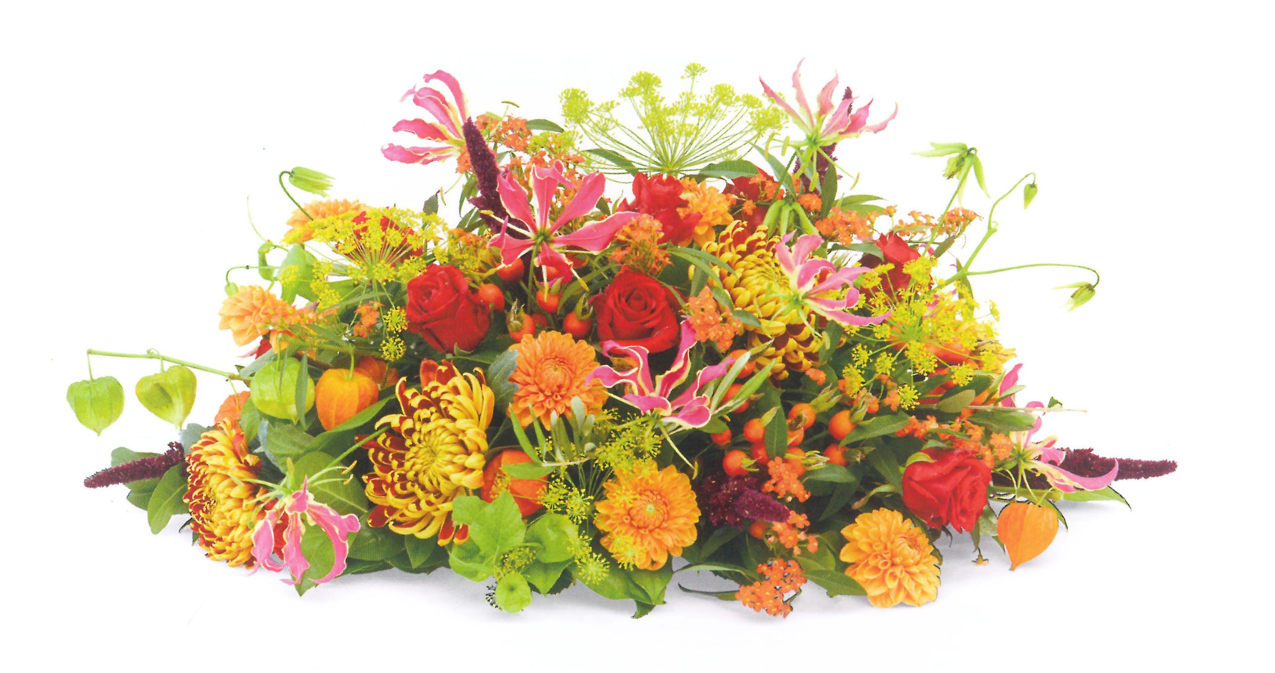 Het ovale bloemstuk ‘Herfstvruchten’ van 80 cm brengt de warme kleuren en natuurlijke rijkdom van de herfst samen in een prachtig, harmonieus arrangement. Dit bloemstuk combineert dieprode, oranje en gouden tinten met subtiele accenten van bladeren en bessen, waardoor het een sfeervol eerbetoon vormt. De ovale vorm symboliseert omarming en oneindige liefde, passend bij een respectvol en betekenisvol afscheid.