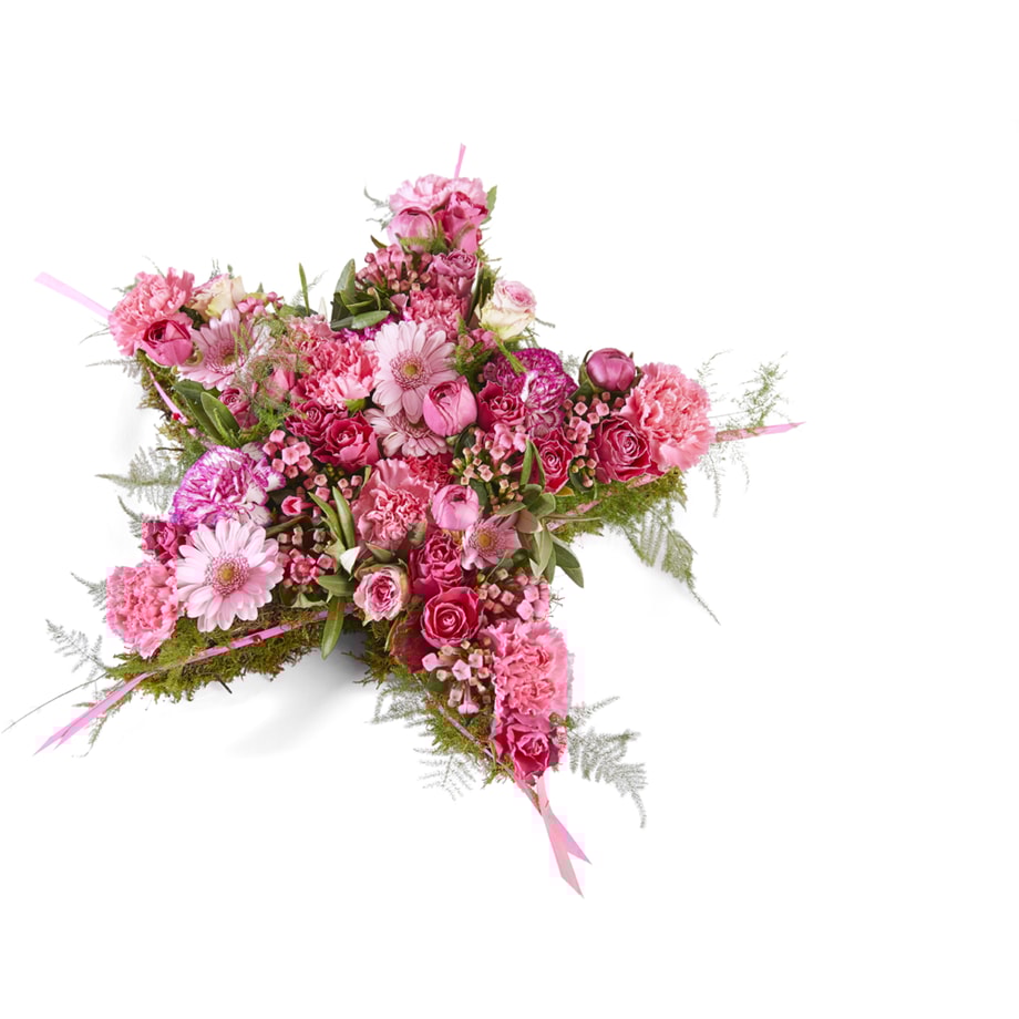 De speciale vorm ‘Mooiste Ster’ is een rozekleurig, stervormig bloemstuk