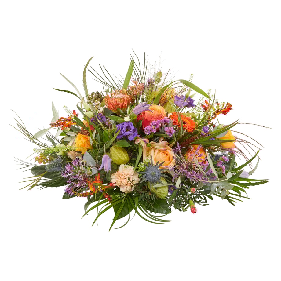 Het ronde bloemstuk ‘Speelse Warmte’ van 50 cm combineert levendige kleuren en een speels ontwerp om een warme en liefdevolle sfeer te creëren. Met zorgvuldig gekozen bloemen straalt dit bloemstuk een gevoel van vreugde en verbondenheid uit, wat het een prachtig en betekenisvol eerbetoon maakt tijdens een afscheid. De ronde vorm staat symbool voor continuïteit en de oneindige liefde voor een dierbare.