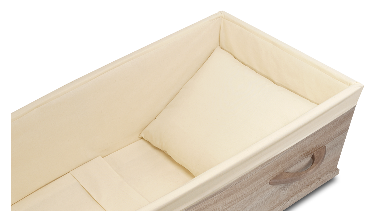 Spaanplaat uitvaartkist met greywax houtdecorfolie en katoenen interieur