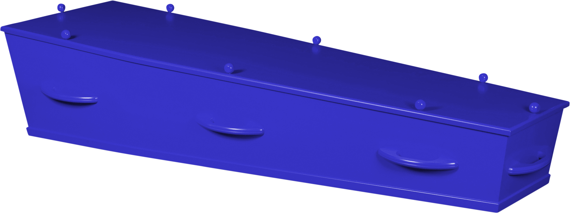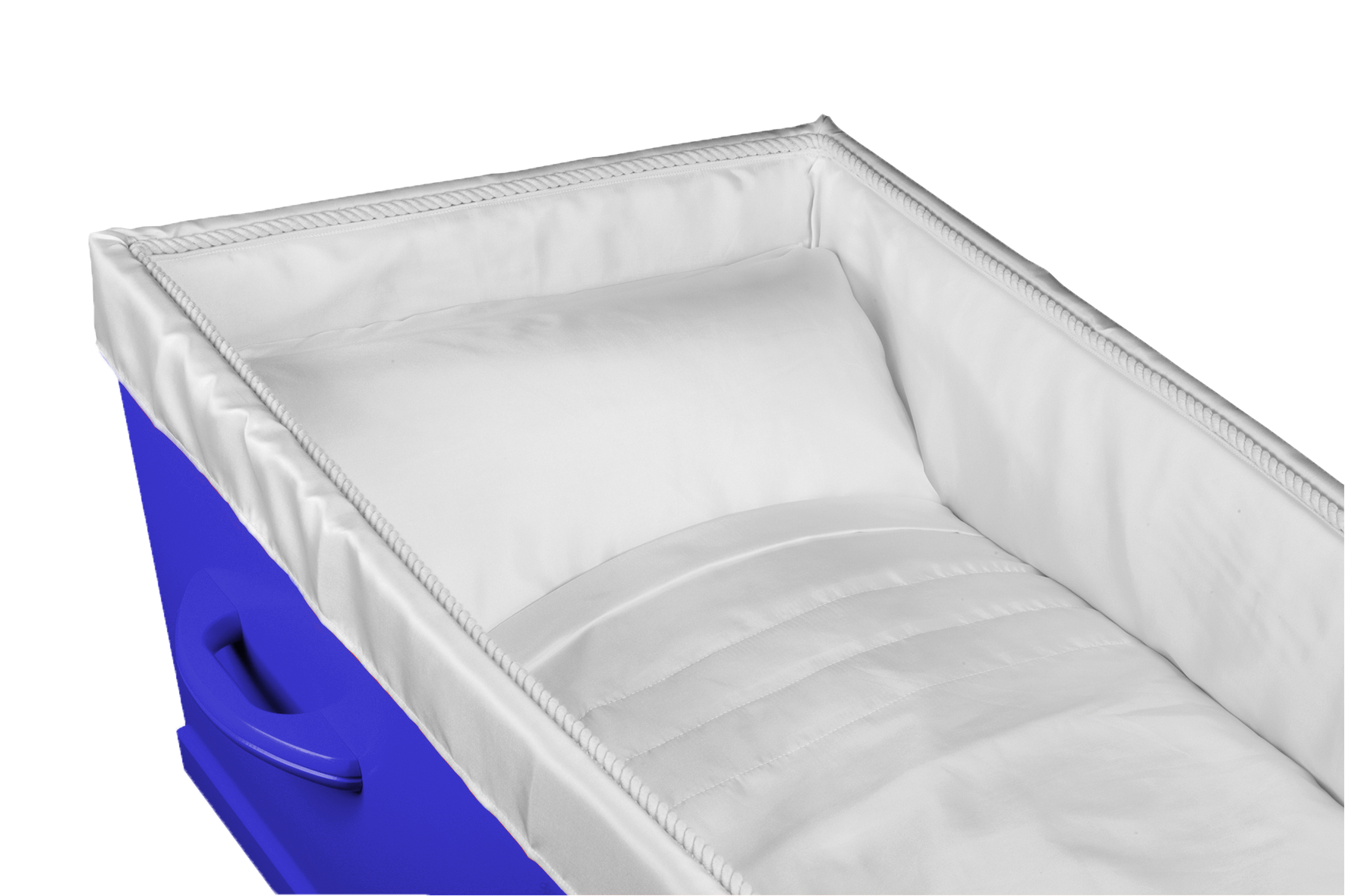 Eenvoudige blauwe spaanplaat uitvaartkist met satijnen interieur
