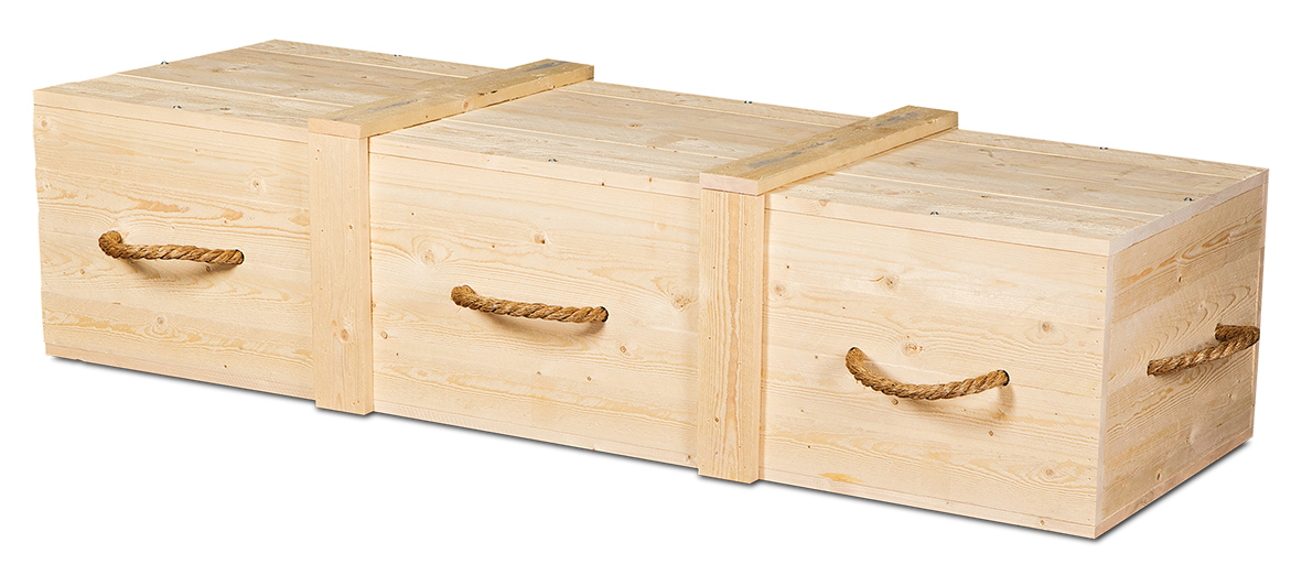 Uitvaartkist van vurenhout met touwgrepen, verzonken schroeven en katoenen interieur