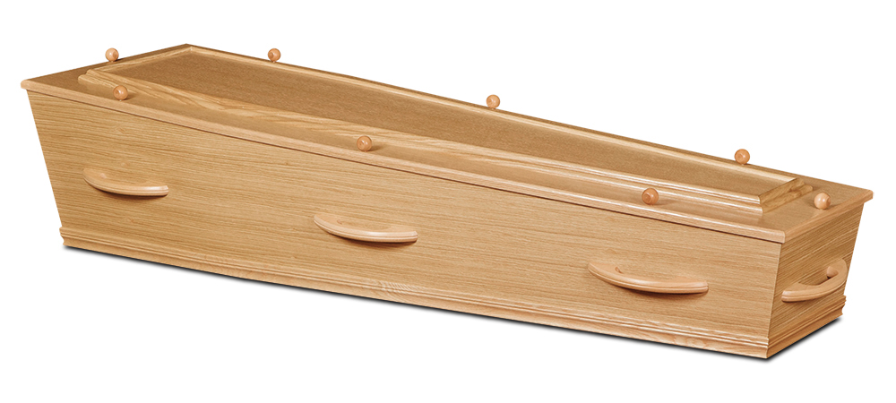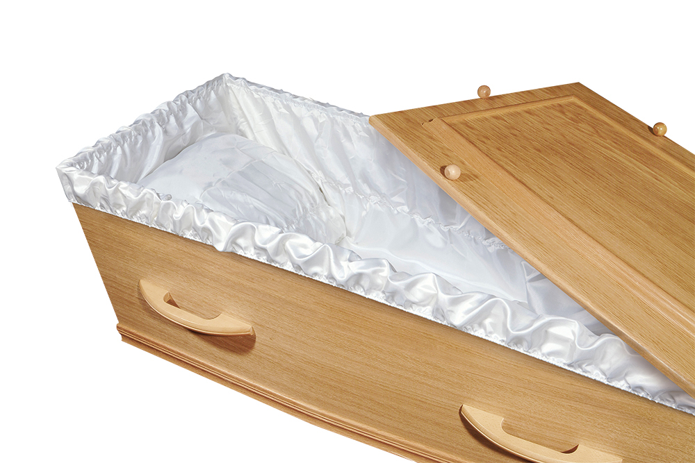Eenvoudige uitvaartkist met eikenfineer, oplegdeksel en satijnen interieur