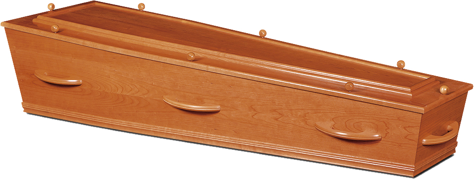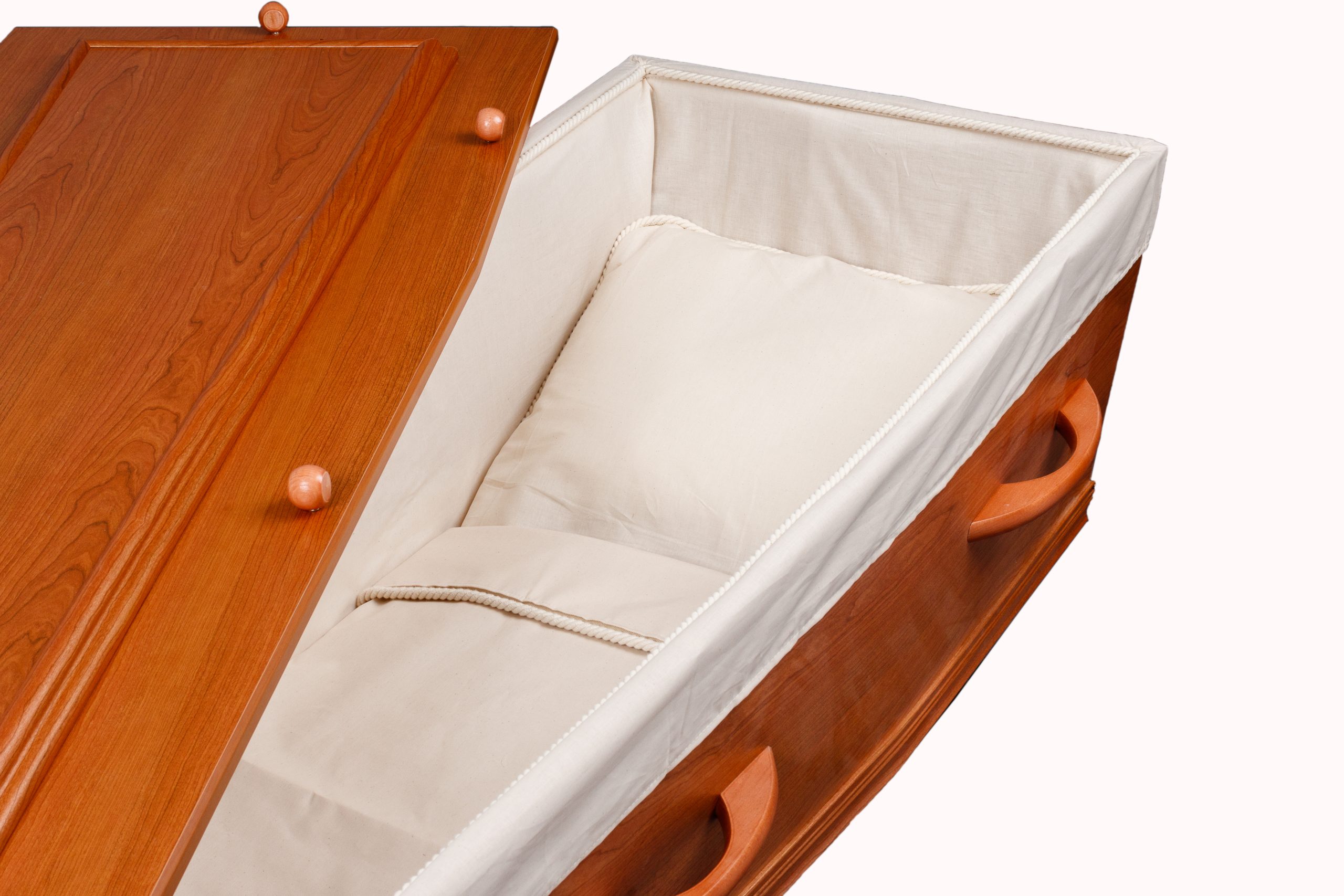 Eenvoudige spaanplaat uitvaartkist met kersenfineer, kroondeksel en katoenen interieur