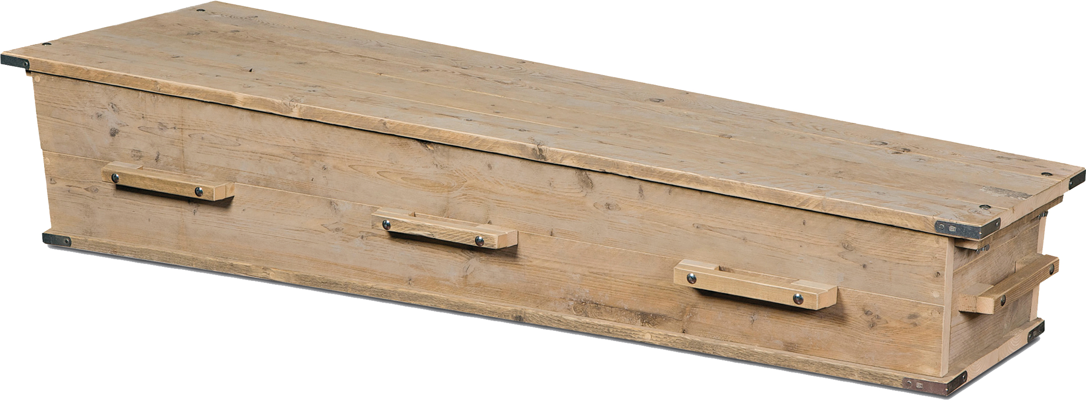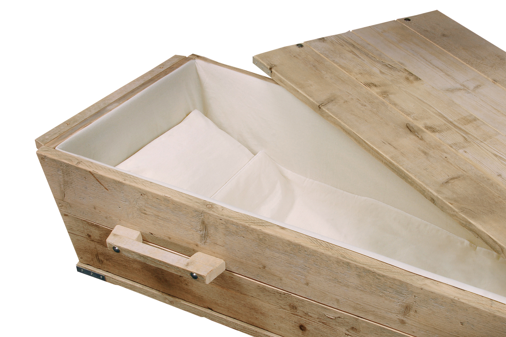 Uitvaartkist van houten planken, die oorspronkelijk zijn gebruikt in de bouw, met katoenen interieur