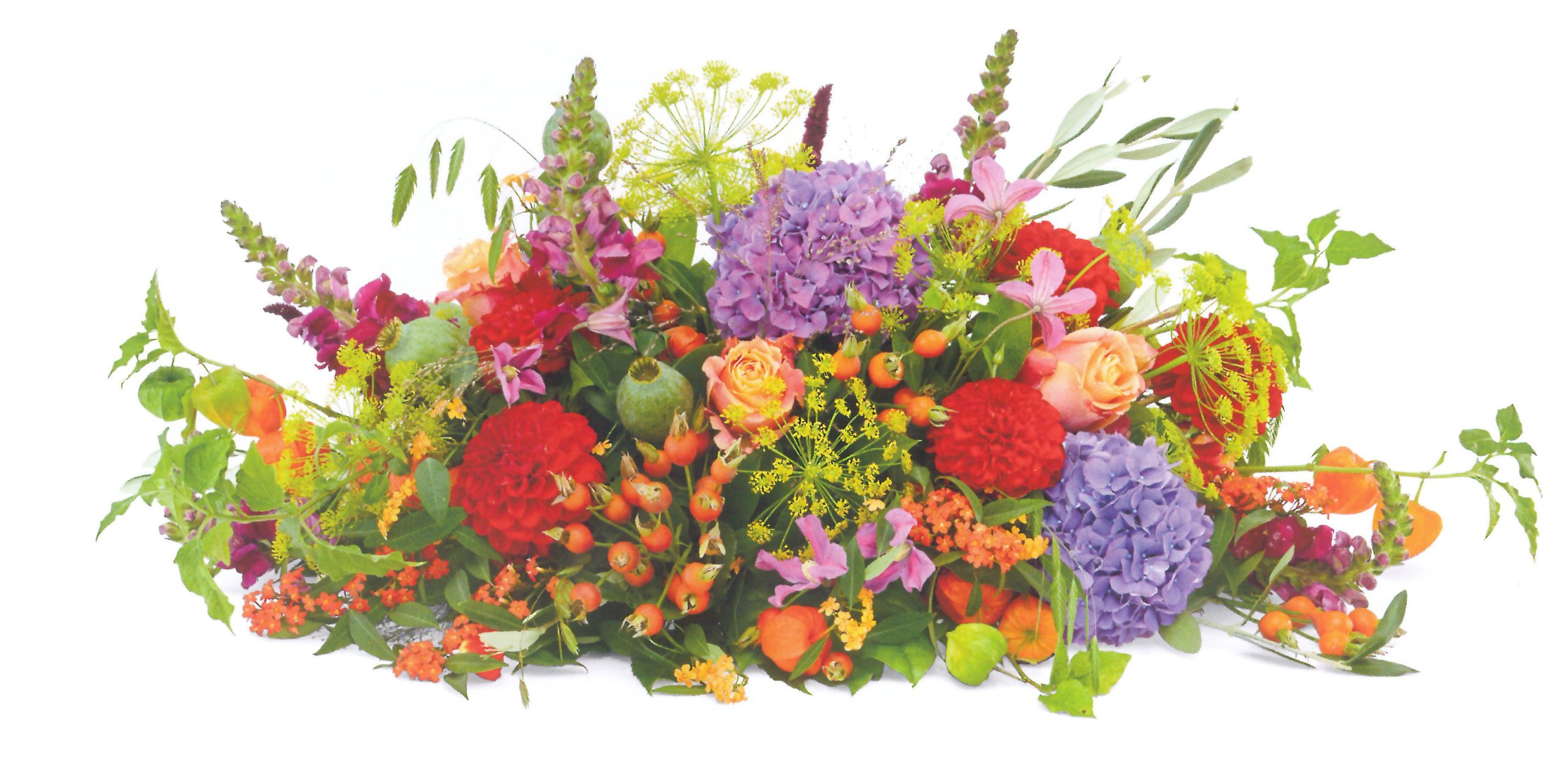 Het ovale bloemstuk ‘Warme Weelde’ is een luchtig en modern kleurrijk bloemstuk