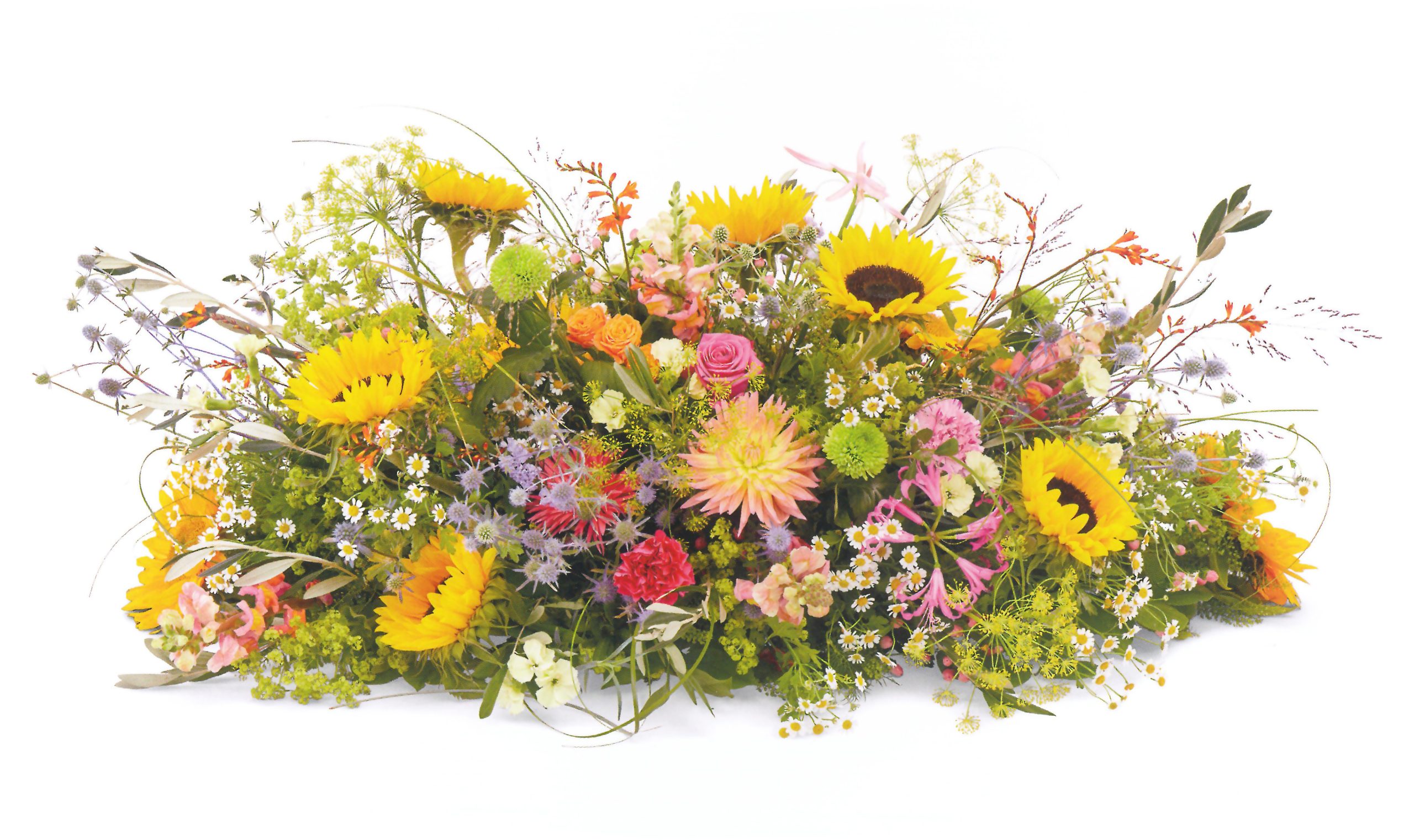 Door de zomerse kleuren en harmonieuze samenstelling is ‘Zonneschijn’ een mooi en respectvol eerbetoon aan een dierbare. Dit halve kistbedekkende bloemstuk brengt zowel sereniteit als levendigheid, waardoor het een passend symbool van afscheid is tijdens de lente- en zomermaanden.