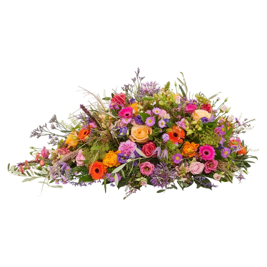 ‘Zonsondergang’ brengt een serene sfeer die troost en verbondenheid biedt aan familie en vrienden. De rijke kleuren en verfijnde samenstelling maken dit bloemstuk tot een stijlvolle keuze voor een persoonlijk afscheid. Het is een prachtige manier om het leven van een dierbare te eren en tegelijkertijd een blijvende herinnering aan de warmte en schoonheid van gedeelde momenten te koesteren.